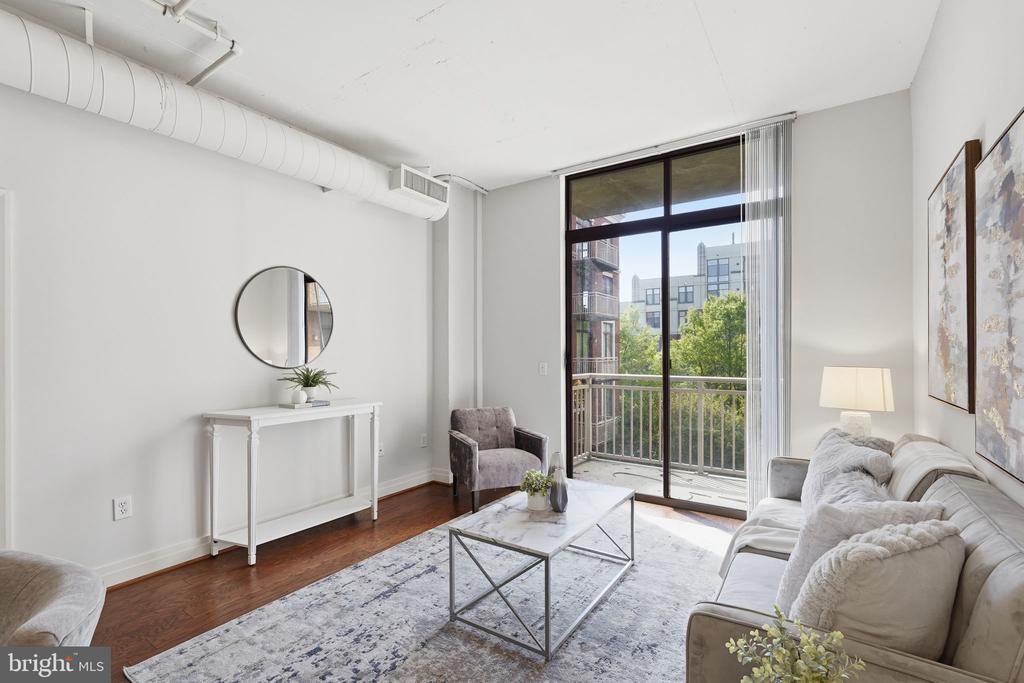 Welcome to Unit 401 at the Residences at Station Square, a beautifully updated loft-style one-bedroom in the heart of Clarendon, where modern comfort meets industrial-chic design. Inside, soaring 11-foot ceilings, exposed ductwork, and clean architectural lines create the signature loft aesthetic, while abundant natural light pours in through oversized windows and glass doors. Warm hardwood floors run throughout the main living area, adding richness and contrast to the light, neutral palette. The open-concept living and dining space is both inviting and functional, ideal for everyday living or entertaining. A thoughtfully designed layout flows to a private east-facing balcony overlooking the community pool and courtyard, perfect for morning coffee, quiet evenings, or enjoying the view. The kitchen features classic wood cabinetry, granite countertops, and stainless-steel appliances, with a convenient breakfast bar that overlooks the main living space. The spacious bedroom offers large windows, soft natural light, and ample closet space. The dual-entry bathroom features a tub/shower combination and direct access from both the bedroom and main living area. An in-unit washer and dryer add everyday ease. One garage parking space conveys. Just two blocks from the Clarendon Metro, the Residences at Station Square offers exceptional amenities including a two-level outdoor pool and billiards room all set within one of Arlington’s most vibrant neighborhoods, surrounded by top restaurants, shops, and nightlife. Stylish, light-filled, and ideally located, Unit 401 is Clarendon loft living at its best.