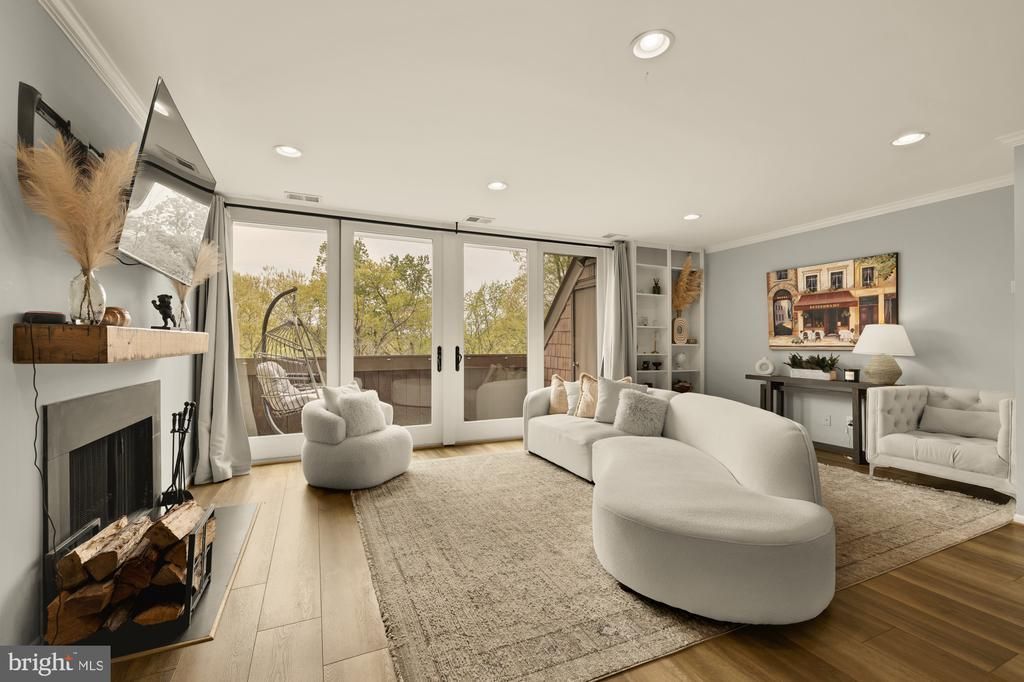 Live in the heart of Shirlington, where everything is just steps away. This beautifully updated 3-bedroom, 2.5-bath two-level condo offers the feel of townhome living with unbeatable walkability to restaurant, shops, public transit, a movie theater, library, parks, dog parks, I-395, breweries, coffee spots, and more. Inside, enjoy a bright, open-concept layout featuring LVP flooring, modern light fixtures, recessed lighting, elegant crown molding, and oversized contemporary windows. The main living area is a showstopper with floor-to-ceiling windows, custom built-ins, and a classic fireplace, all opening to a private balcony with elevated views. The kitchen is both stylish and functional, showcasing stainless steel appliances, granite countertops, white cabinetry, and a timeless subway tile backsplash. Upstairs, the primary suite impresses with a full wall of windows and a beautifully updated en-suite featuring a walk-in shower, modern vanity, and floor-to-ceiling textured tile with gold finishes. Two additional bedrooms are spacious, filled with natural light, and offer ample storage. Two parking spaces convey, along with 2–3 visitor parking passes. Amenities included are a pool, trash, water, common areas and more.