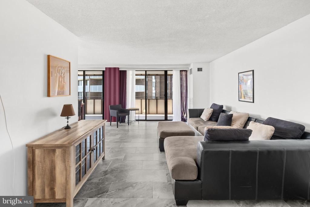 2 BR/ 2 BA 10th floor CORNER UNIT! Most rooms have been freshly painted and have new window treatments. Both bedrooms have brand new plush carpet! With sweeping views of the Alexandria skyline, you'll enjoy the changing seasons from the expansive wraparound balcony. Note the custom privacy wall upon entering, adding intimacy in the living space from the foyer. Elegant new ceramic tile floors throughout living and dining areas. Sunshine pours in through floor to ceiling windows to bathe every room in abundant natural light. The sunny kitchen has lots of storage and a new dishwasher. The large primary suite can comfortably fit a king bed and offers a walk-in closet and ensuite BA. The secondary BR can be a guest room/home office. Plenty of closets and storage! Washer and dryer in unit! Garage space #37 conveys along with a parking pass for one unassigned spot in the parking lot. A storage unit in the basement houses luggage and seasonal decorations. Condo fee includes all utilities except electric and cable. Templeton is a pet friendly community and is well managed with secure access and on-site management Mon - Fri. Amenities include a party room, an outdoor pool with a large lounge area and bathhouse, basketball court, tennis court, tot lot, and terraces for picnics and grilling surrounded by lovely manicured grounds. Close to both Van Dorn Station Shopping Center and Van Dorn Plaza for groceries, drug store, pet store and diverse dining options. Located minutes from Eisenhower Ave Metro Station and the new INOVA hospital complex. Accessible to I-395 and 495 for a quick commute to the Pentagon, Amazon HQ2, downtown DC, Old Town Alexandria and Reagan National Airport.